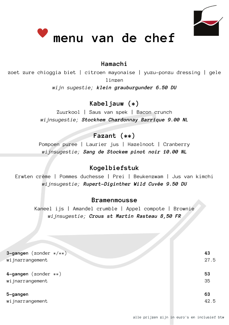 Er zijn ongeveer 170 verschillende wijnen op voorraad. Waarvan tenminste 15 ook per glas te bestellen. Uiteraard zijn er altijd wijnkenners aanwezig om u te begeleiden in de diverse keuzes. Ook voor de niet wijnliefhebber is er ruime keuze.